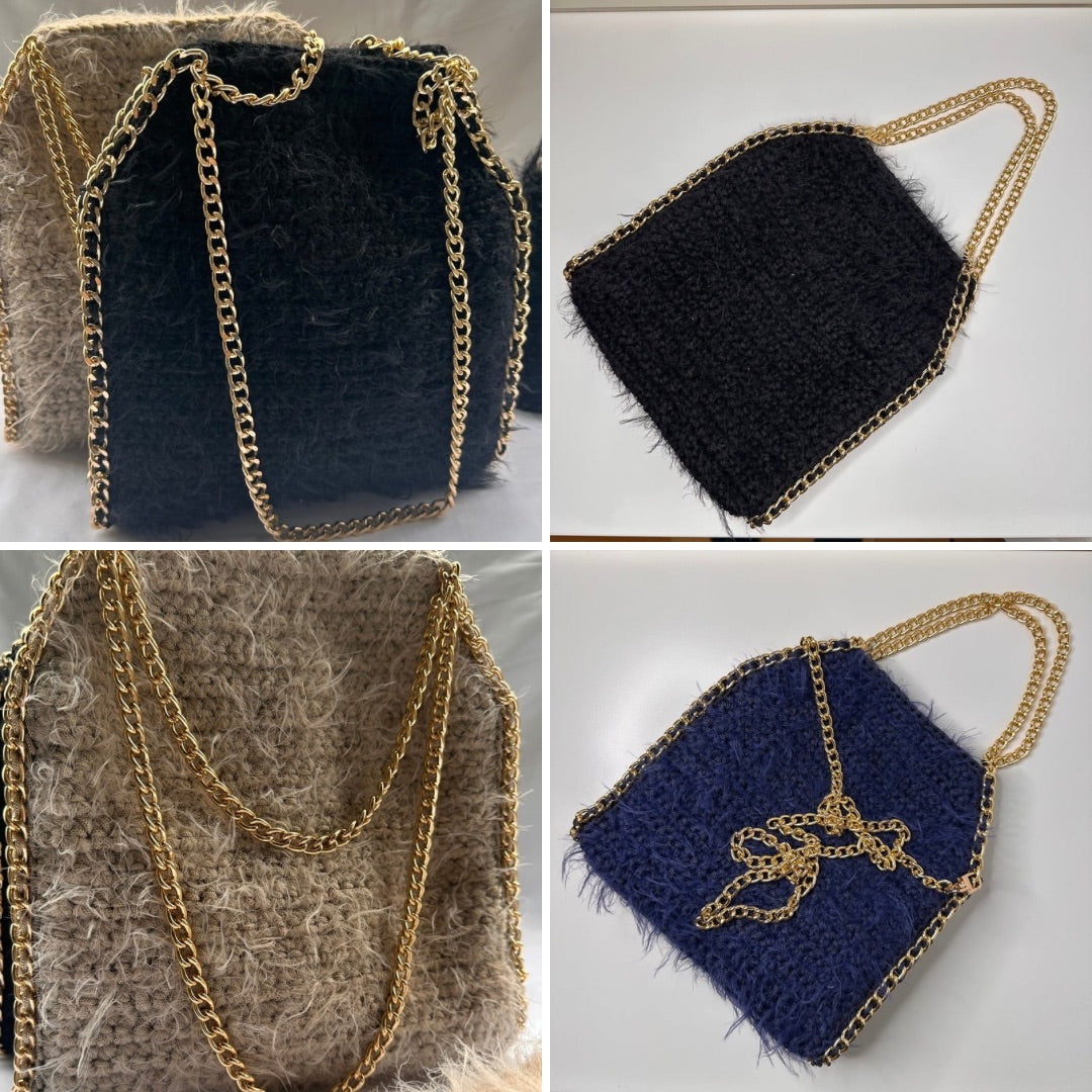 - Tracolla: catena in alluminio oro oppure argento di lunghezza cm 120 e manici cm 30 (per il colore della catena verrai contattata successivamente alla chiusura dell'ordine)