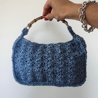 - 2 matasse da 50 gr l'una di rafia di viscosa Adriafil (io ho utilizzato colore denim acquistato da La Mercerissima). Totale 100 gr di rafia viscosa (potete utilizzare altra marca