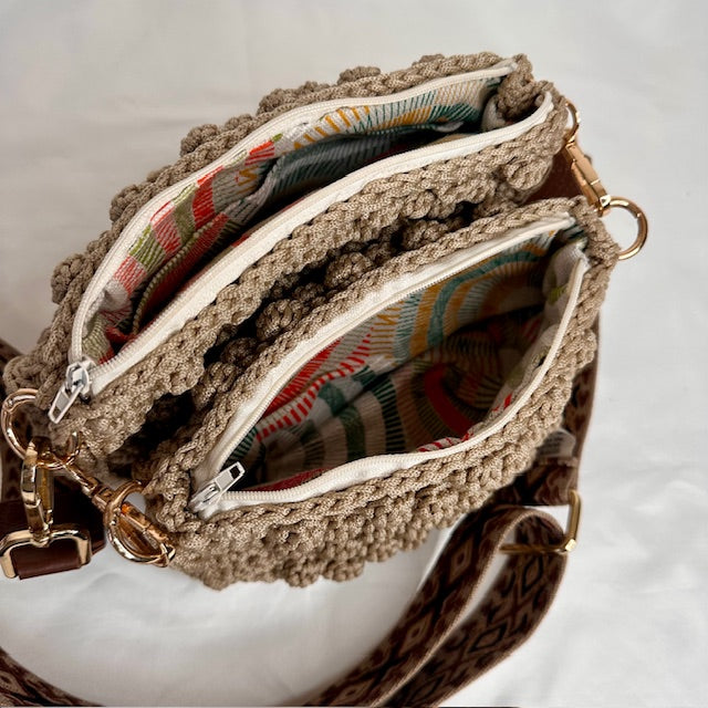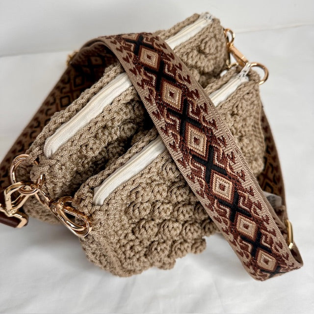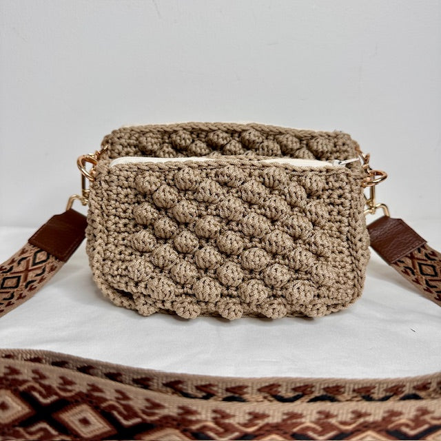 - Tracolla in tessuto con disegno geometrico color marrone e tortora di lunghezza regolabile ( cm 80-130) e tracolla a spalla a catena oro cm 65